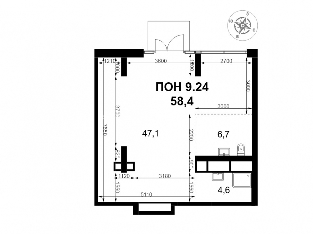 Общая площадь: 58.4 м2