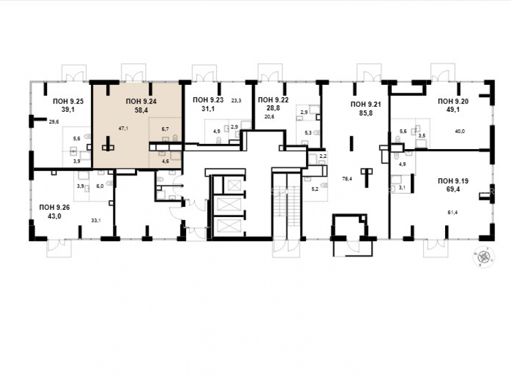 Помещение на 1 этаже 25и этажного корпуса, общей площадью 58.4м2, отдельный вход, Эл. мощность 0.2 кВт на м2, высота потолков: 4.6м2, отделка: Shell&core, открытая планировка. Витринные окна.