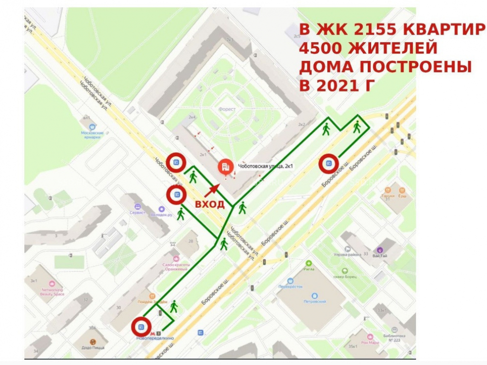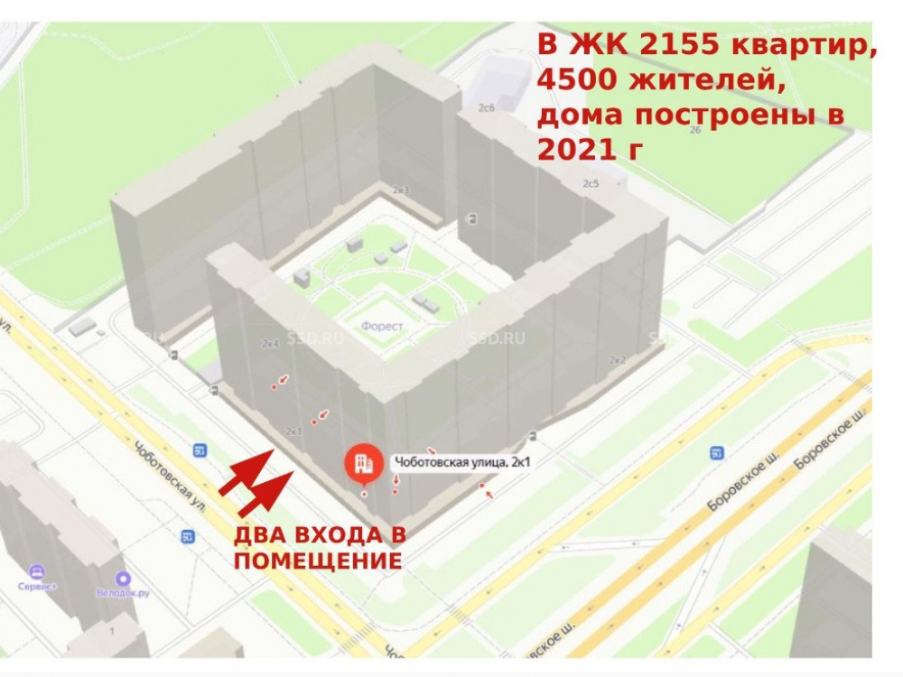 Продажа торгового помещения с арендатором, по адресу: Москва, Чоботовская ул., 2к1. Ближайшая станция метро - м. Новопеределкино, 3 минуты пешком. Помещение находится на 1ом этаже жилого дома. Первая линия. ЖК "Форест" расположен в крупном, жилом районе, насчитывает более 50 000 жильцов. Всего в 1 минуте остановка общественного транспорта. Жилой комплекс сдан, идет активное заселение, квартиры с ремонтом. Количество квартир - 2255 шт.