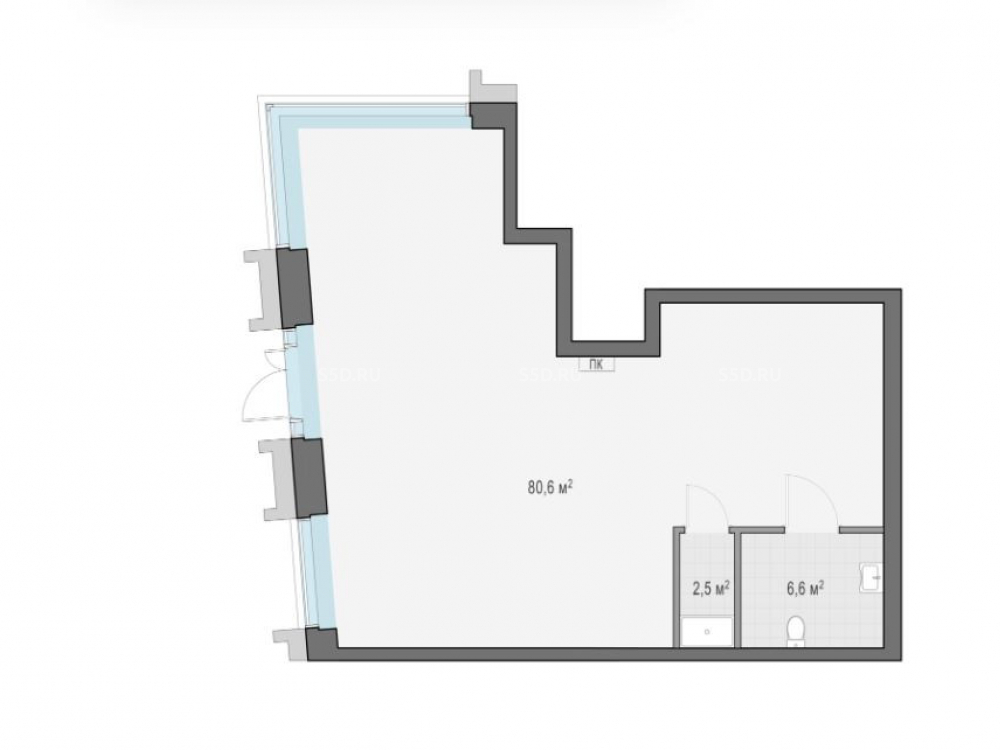 помещение на первом этаже жилого дома площадью 89,7 м2 с отдельным входом, витринное остекление, электр. мощность 30 кВт., потолки 3,6 м, мокрая точка. Срок сдачи - 1 кв 2027 г