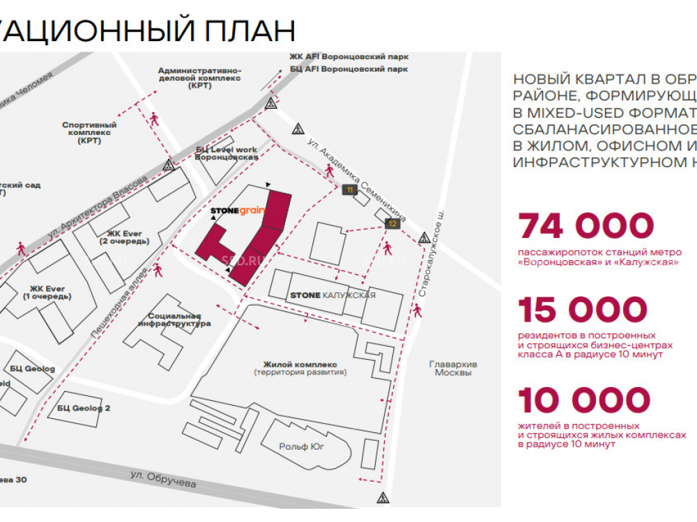 и являться точкой притяжения для жителей районаи сотрудников бизнес-центров в окружении. Расположение ритейла STONE на выходе из метро и на пересечении основных транспортных и пешеходных потоков обеспечит стабильно высокий трафик. Ритейл STONE расположен недалеко от дома и офиса, где всё необходимое находится буквально в двух шагах.