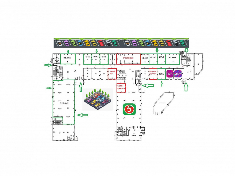 На первом этаже комплекса расположены такие арендаторы как: Гостиница, Пятерочка, озон, вайлдберриз, салон красоты, ресторан и другие.