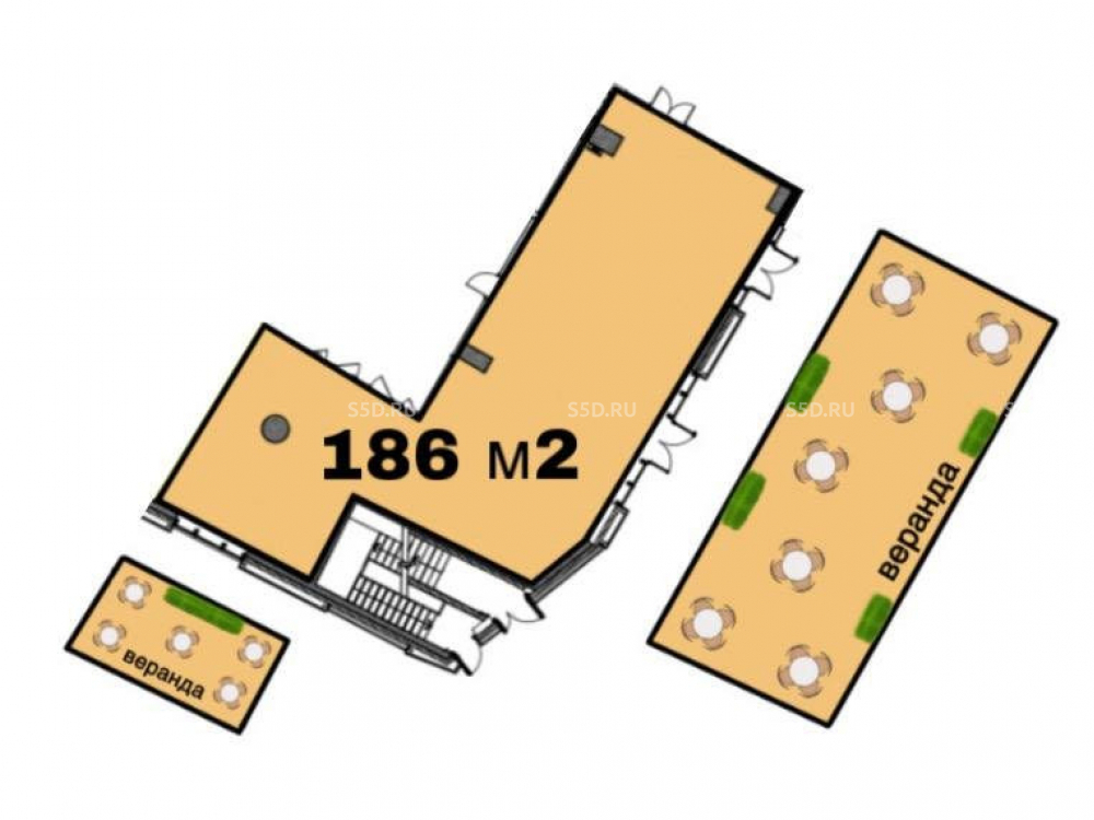 Помещение общей площадью – 186 кв. м., 1 этаж. Угловое. 2 отдельных входа с фасада. Витринные окна. Высота потолков – 5,5-6м. Есть место для размещения двух веранд. Коммуникации и канализация центральные. Без отделки.