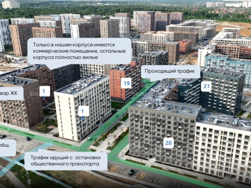 Высокий пешеходный трафик, основная пешеходная тропа, на въезде в ЖК. Мало коммерческих помещений, только в первой линии домов.