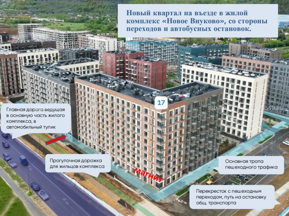 Помещение находится на 1й линии, пешеходная зона/основная пешеходная тропа, на въезде в ЖК. Расположено по пути следования жителей на самом трафиковом коридоре ЖК.