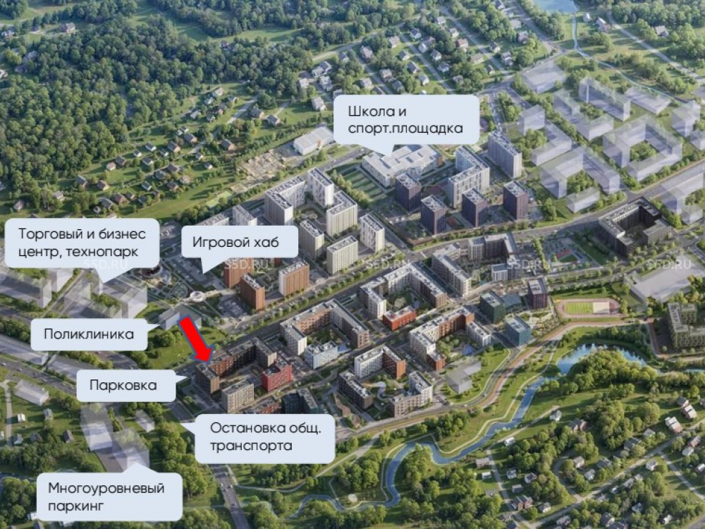 ЖК строят в 24 км к юго-западу от МКАД и в 4 км от аэропорта. Первые корпуса сдали в марте 2023 года.