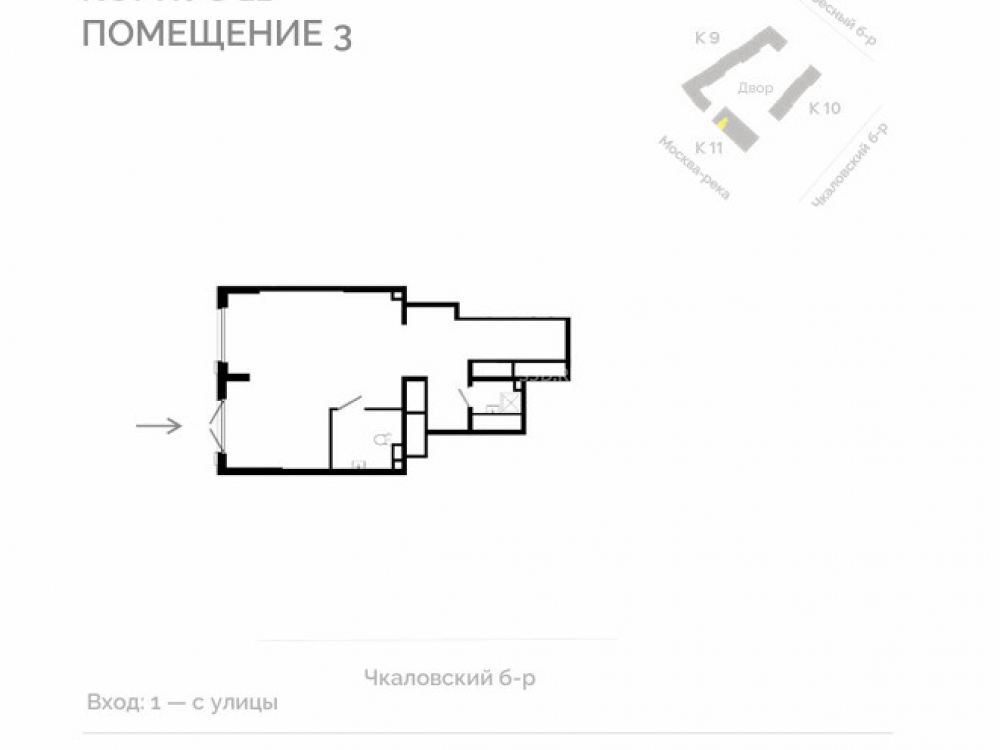 1 этаж 26-ти этажного жилого дома, площадью 64.9 м², высота потолков 5 м, приточно-вытяжная вентиляция, отдельная входная группа, витринное остекление, место для размещения вывески, отделка - Shell & Core.