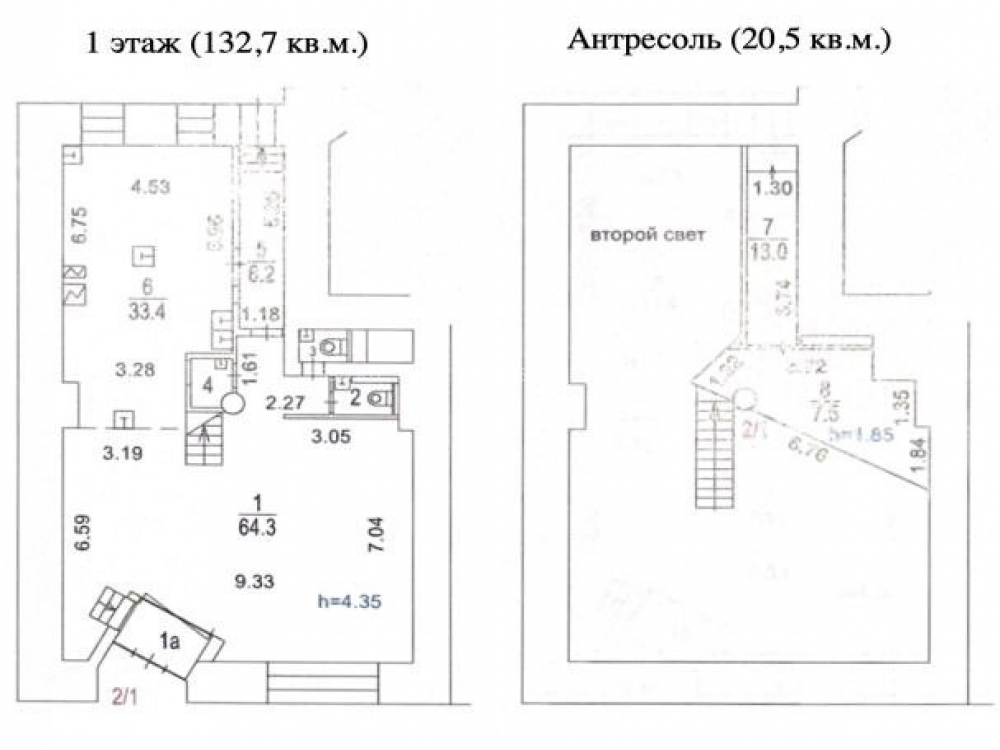 на 1-м этаже — 4.35 м., на антресоли — 1.8 м.