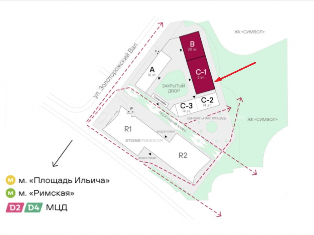 Высокий пешеходный трафик достигается расположением вблизи бизнес-центра класса А (STONE Римская) на 6,5 тысяч сотрудников