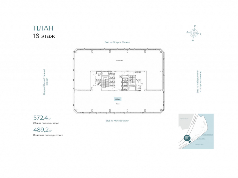 БЦ расположен на первой линии Москвы-реки, на курортной территории «Острова мечты». В рамках 18-этажного офисного здания предполагается набережная с гастро променадом, возведение гостиницы с сервисом 4* и жилой комплекс премиум-класса.