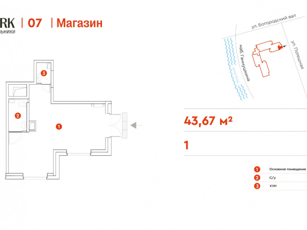 Ближайшая станция метро - Преображенская площадь, 15 минут пешком. Помещение расположено на 1 этаже жилого дома. ЖК бизнес-класса EVOPARK Сокольники строится в локации с высоким трафиком. Ввод в эксплуатацию – IV квартал 2026 года. В ЖК запроектировано 2 корпуса переменной этажности до 21 этажей, 722 апартаментов. Численность резидентов 1300 человек. Свыше 42 000 человек проживает в радиусе 1 км.