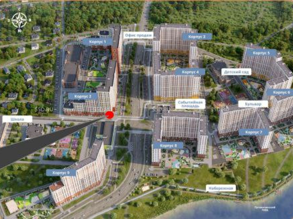 Помещение расположено в современном эко-квартале комфорт-класса с собственной прогулочной набережной. Комплекс включает 9 корпусов переменной этажности (от 6 до 24 этажей). Срок сдачи: 2 квартал 2025 года.