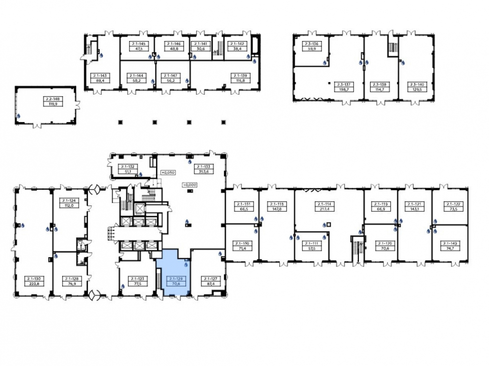 На первых этажах - дизайнерские лобби с зонами ресепшен, лаунж-зонами, а также кафе, магазины и сервисные службы;