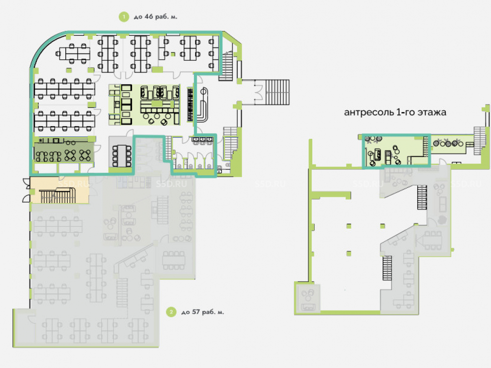 Предусмотрена антресоль с размещением кухни на 16 мест. Офис оборудован отдельным санузлом, 2 входами, местом для курения.