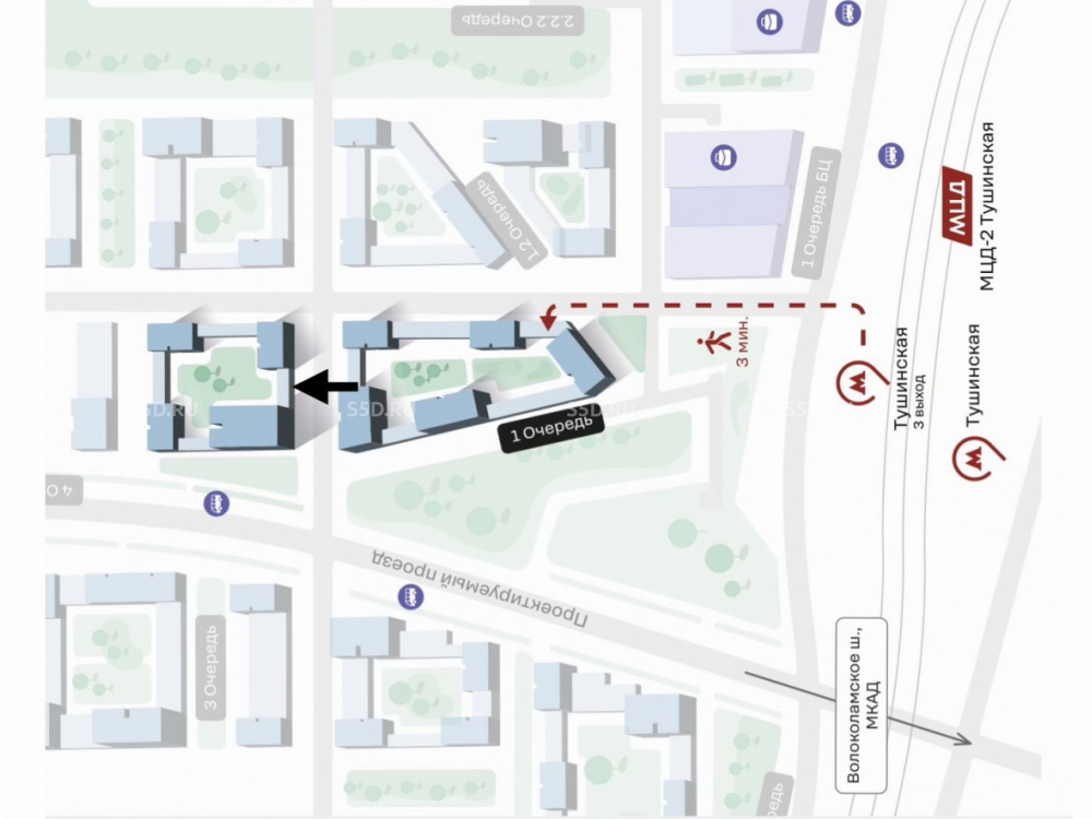 3 минуты от станции метро Тушинская. 6 минут от Волоколамского шоссе. 8 минут от МКАДа.