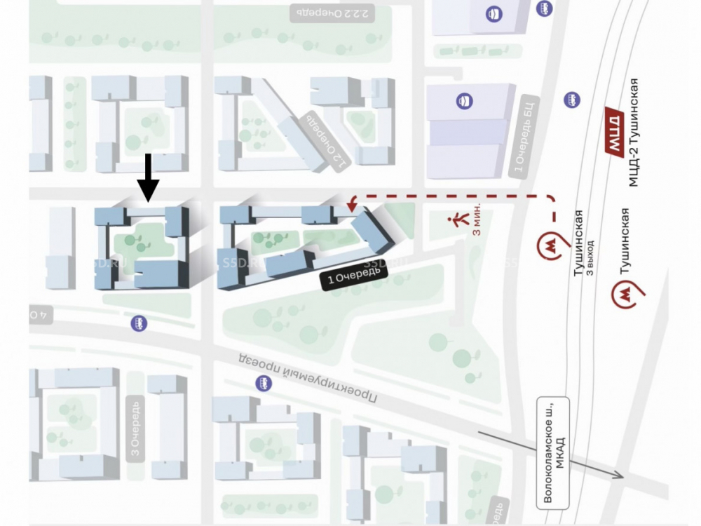 Транспортная доступность: 3 минуты от станции метро Тушинская. 6 минут от Волоколамского шоссе. 8 минут от МКАДа.