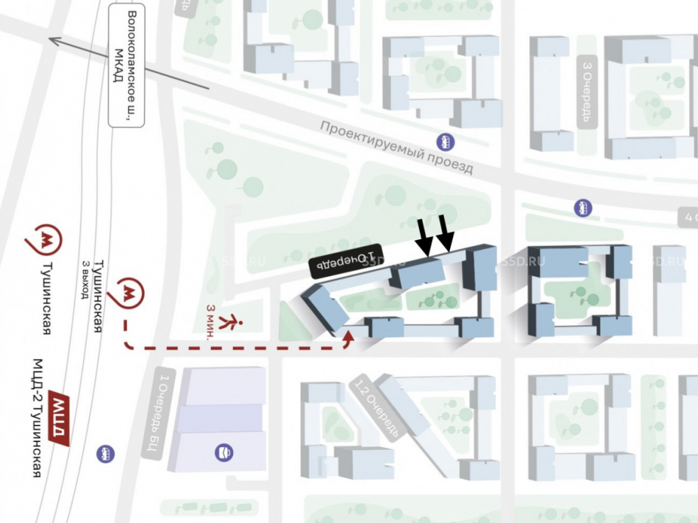 Транспортная доступность: 3 минуты от станции метро Тушинская. 6 минут от Волоколамского шоссе. 8 минут от МКАДа.