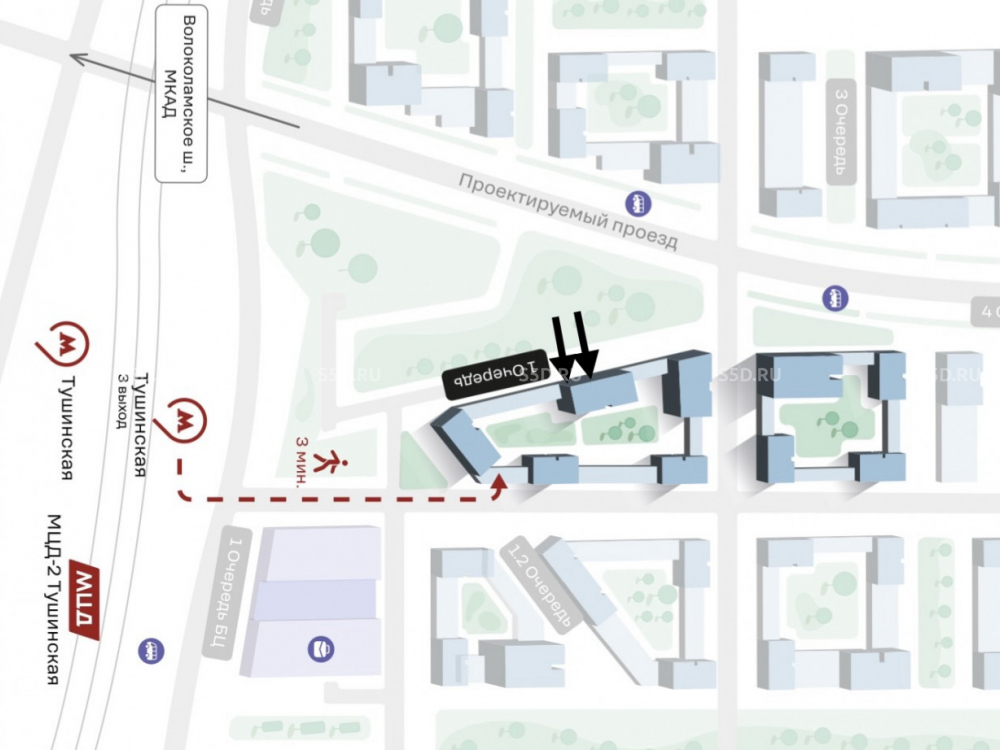 3 минуты от станции метро Тушинская. 6 минут от Волоколамского шоссе. 8 минут от МКАДа.