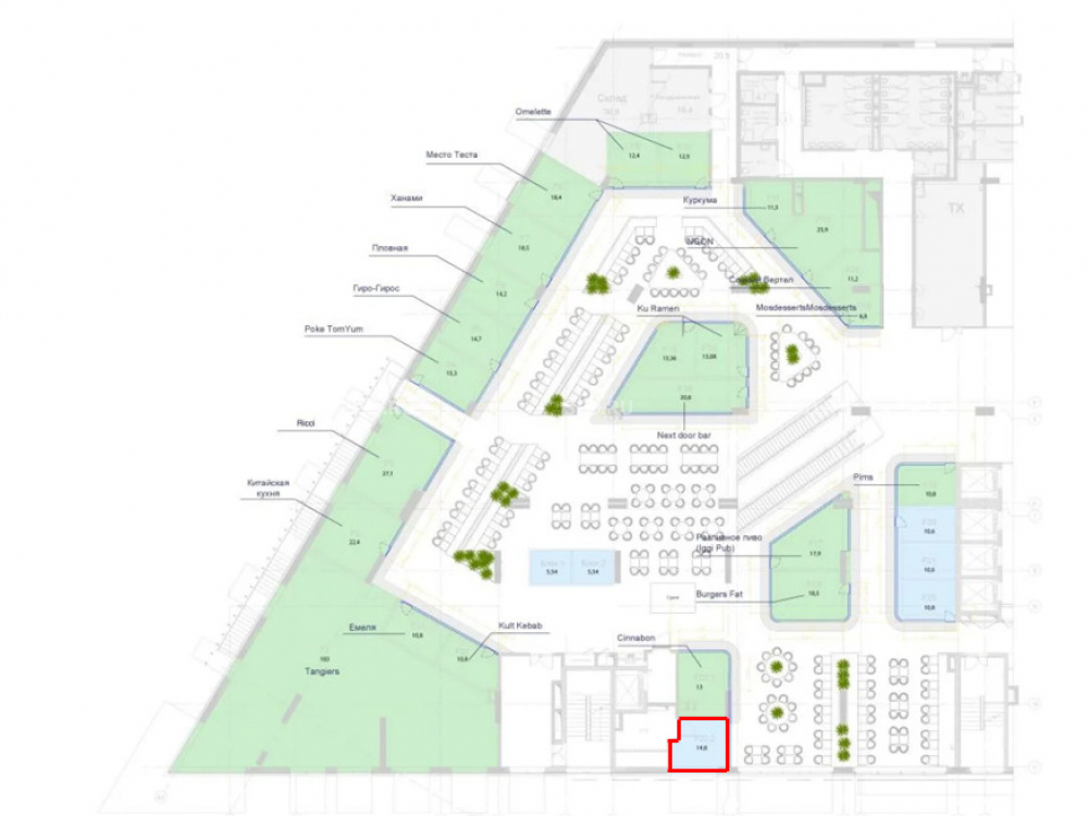 Торговое окружения - разнообразные кухни мира от восточной до азиатской, бары, кальянная, мармелад.