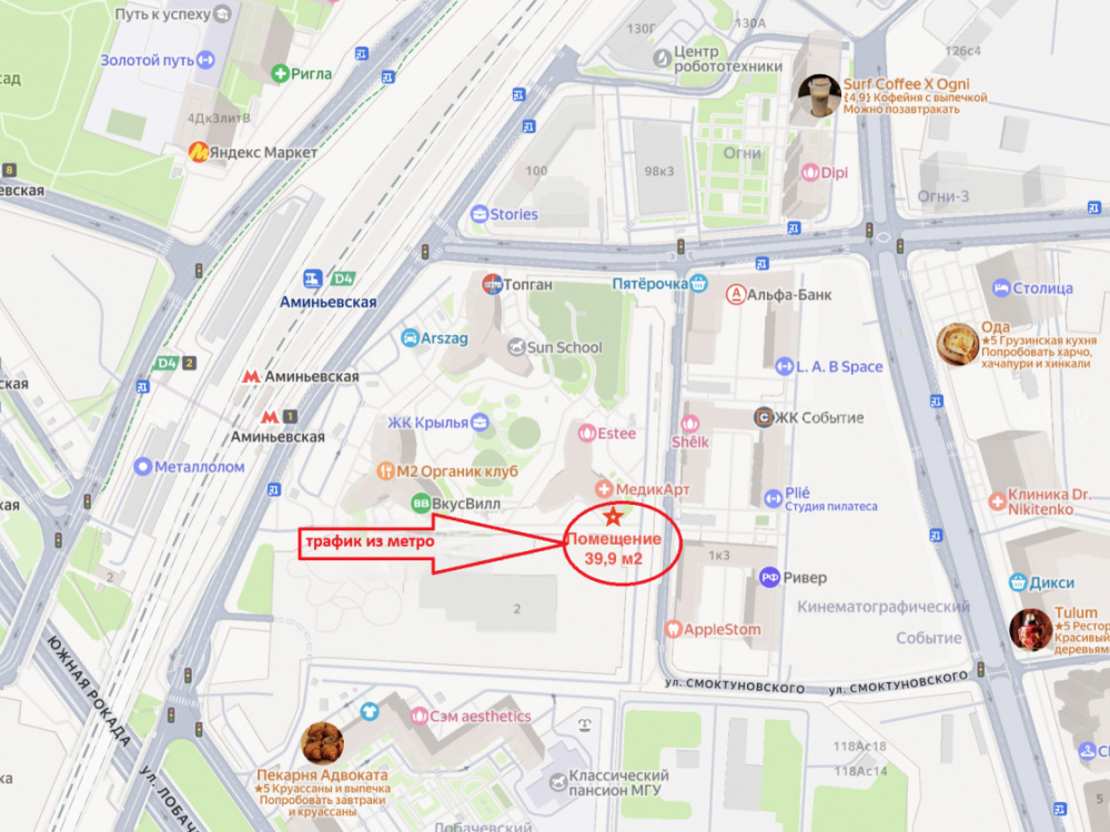 Отдельный вход, высокий рекламный потенциал, отличный пешеходный трафик: помещение выходит на пешеходный бульвар к метро, охватывающий 8 ЖК: ЖК Крылья - 1756 кв. (полностью заселен), ЖК "Событие" ~ 4000 кв., ЖК Огни ~1700 кв. Общее число жителей в результате реализации всех проектов в районе составит более 30 000 человек