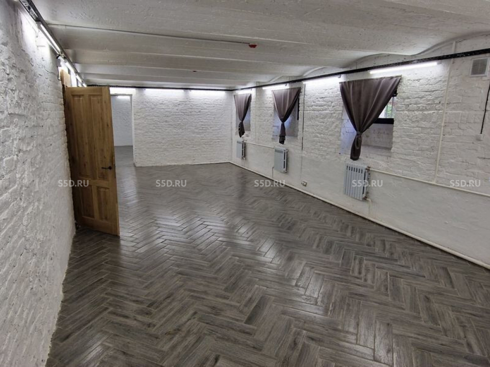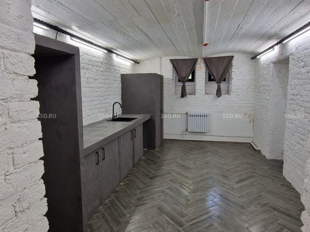 B здании есть светлый цокольный этаж: светлый, подходит для склада или рабочих мест, оборудован кухней и двумя санузлами.