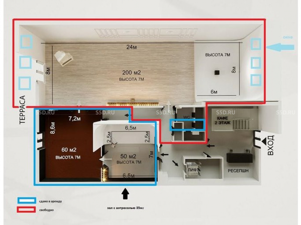 Общая площадь 350 кв.м. (фактическая 500 кв.м за счёт помещений антресоли), 1 этаж + антресоль. 3 изолированных зала, 3 входа (2 из лифтового холла 1-го этажа + дополнительный с автоматическими рольставнями с другой стороны здания). Открытая зальная планировка, помещения с дорогим дизайнерским ремонтом. Высота потолков 3.5 м. Все коммуникации центральные. Выделенная мощность электроэнергии 60 кВт. Свободный доступ 24/7. Охраняемая территория. Паркинг: наземный на 50 м/м на территории, подземный на 100 м/м.