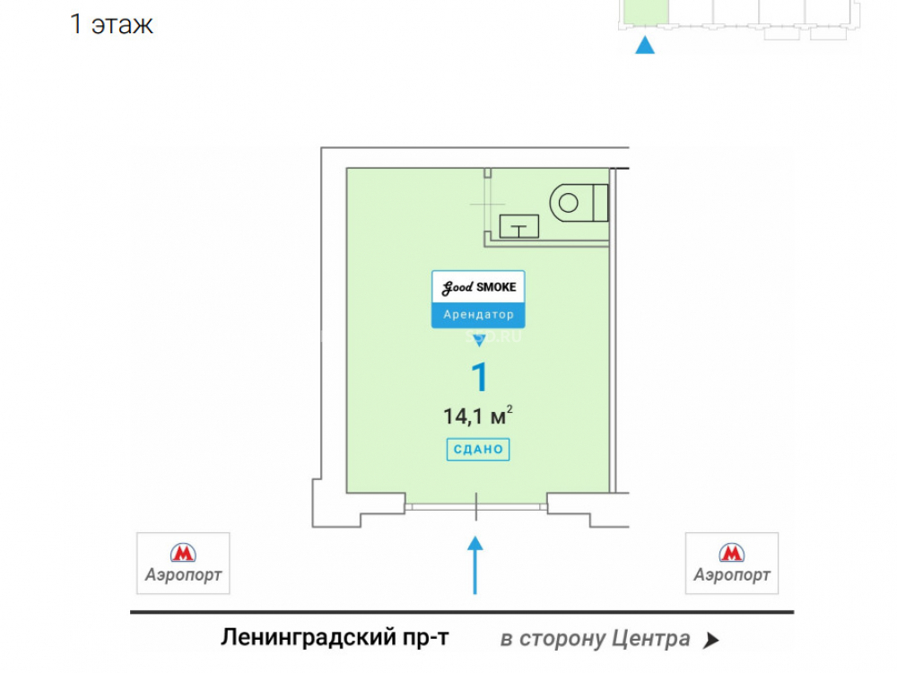 Предлагается в продажу готовый арендный бизнес — помещение формата Street retail с сетевым арендатором площадью 14,1 кв.м на 1 этаже в ОСЗ, расположенного по адресу: Ленинградский проспект, д.62, стр.26, САО г.Москвы. Объект расположен рядом с метро "Аэропорт" - менее 1 минуты пешком.