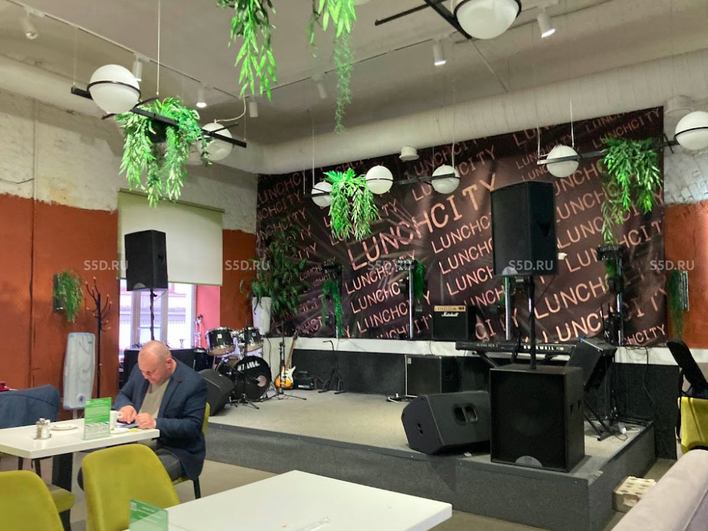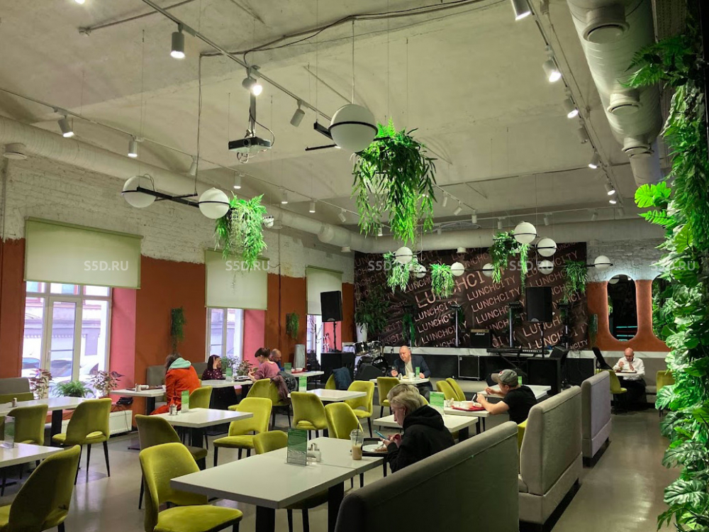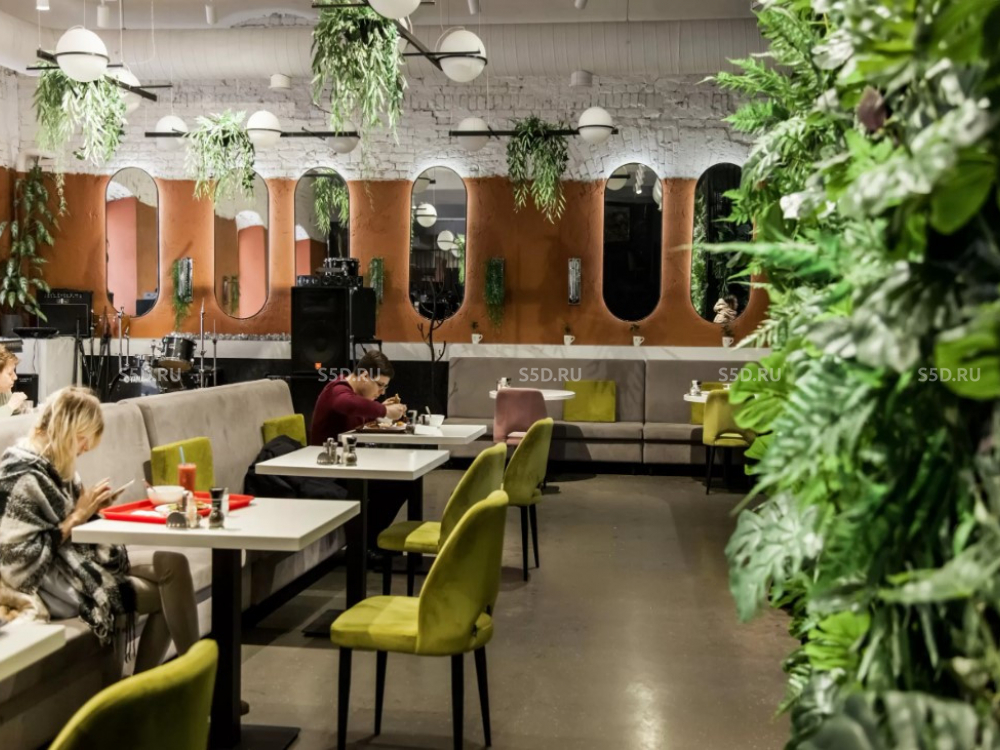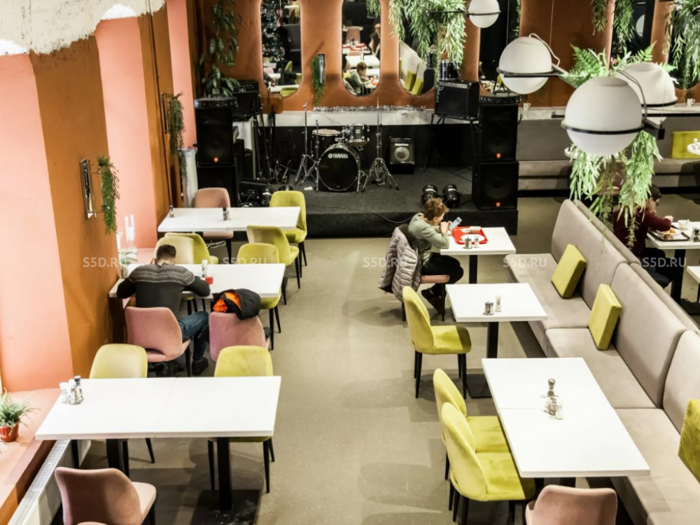 Зона приема пищи (первый и антресольный этаж), небольшая сцена для проведения мероприятий, кухня и технические помещения.