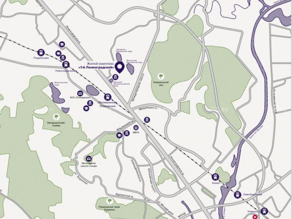 Прямой выезд от комплекса ведет на Ленинградское шоссе. В 1 км от разворота в сторону центра.
