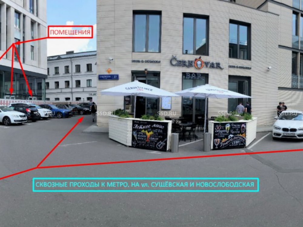 Место с высоким пешеходным трафиком. Сквозной проход от метро к ул. Сущёвская. Деловой район. Рядом здание Сбербанка России.