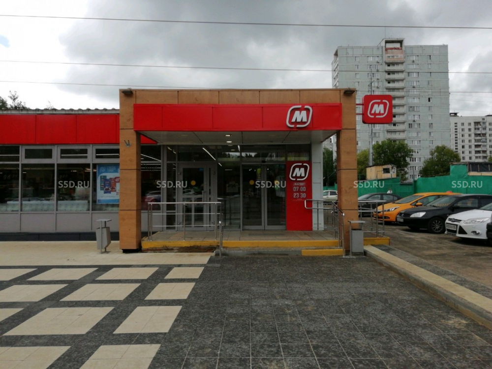 Отдельно стоящее здание в окружении крупного жилого массива. 1-я линия оживленной улицы. Около здания располагается парковка. Интенсивный автомобильный и пешеходный трафик. Напротив магазина остановки общественного транспорта.